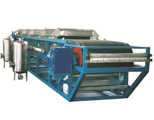 帶式過濾機利用過濾布兩側(cè)的壓力差,將材料中的大部分水分通過過過濾布,流出機體外,材料在過濾室內(nèi)形成過濾餅,達到過濾目的。過濾過程中濾布兩側(cè)存在較大壓力差,提高過濾速度降低蛋糕含水,采用特制濾布,清晰過濾液,過濾效果比真空過濾機理想得多。