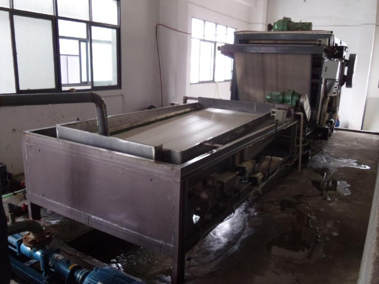 物料經(jīng)投料器加絮凝劑進(jìn)入絮凝劑混合器反應(yīng)后流入重力預(yù)脫水段;物料在重力的作用下進(jìn)行過濾。經(jīng)兩道預(yù)脫水的物料隨著上、下濾帶不斷向前移動(上下濾帶由變頻調(diào)速器控制的傳動機(jī)構(gòu)驅(qū)動),首先進(jìn)入“鍥”形壓榨段;在“鍥”形壓榨中,一方面使物料平整,另一方面使物料受到輕度壓力使物料脫水;其次進(jìn)入“S”形壓榨段,在“S”形壓榨段中,物料被夾在上下兩層濾帶中間經(jīng)若干個不同口徑的輥筒反復(fù)壓榨對物料形成剪切作用,使物料脫水。脫水后的濾餅經(jīng)刮刀將濾餅刮落,而上下濾布繼續(xù)前移清洗后重新進(jìn)入下一個工作循環(huán)。整個過程周而復(fù)始的連續(xù)進(jìn)行。