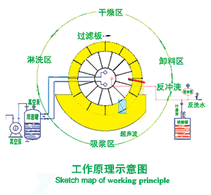 吸漿區(qū):工作時浸沒在料漿的過濾板在毛細(xì)作用下結(jié)合真空壓力,表面吸附成一層濾餅,濾液通過濾板進分配閥至排液罐。