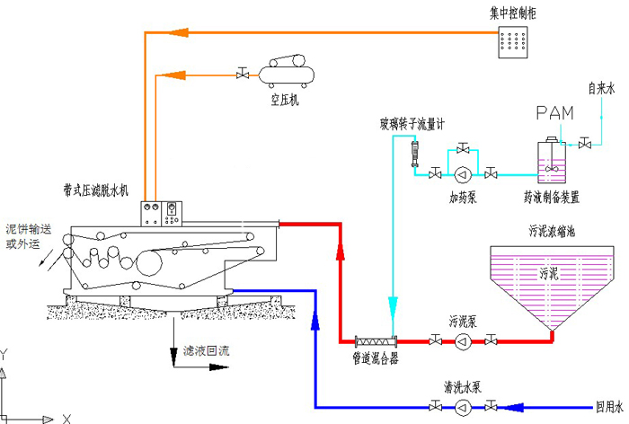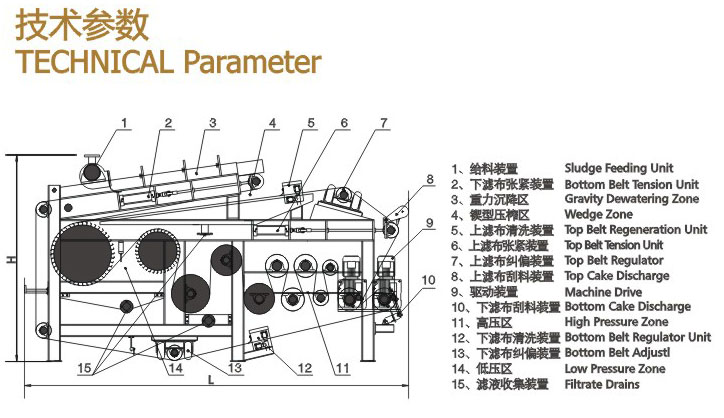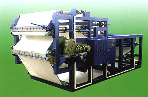 物料經(jīng)投料器加絮凝劑進(jìn)入絮凝劑混合器反應(yīng)后流入重力預(yù)脫水段;物料在重力的作用下進(jìn)行過濾。經(jīng)兩道預(yù)脫水的物料隨著上、下濾帶不斷向前移動(上下濾帶由變頻調(diào)速器控制的傳動機(jī)構(gòu)驅(qū)動),首先進(jìn)入“鍥”形壓榨段;在“鍥”形壓榨中,一方面使物料平整,另一方面使物料受到輕度壓力使物料脫水;其次進(jìn)入“S”形壓榨段,在“S”形壓榨段中,物料被夾在上下兩層濾帶中間經(jīng)若干個不同口徑的輥筒反復(fù)壓榨對物料形成剪切作用,使物料脫水。脫水后的濾餅經(jīng)刮刀將濾餅刮落,而上下濾布繼續(xù)前移清洗后重新進(jìn)入下一個工作循環(huán)。整個過程周而復(fù)始的連續(xù)進(jìn)行。